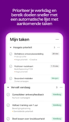 Creëer gemakkelijk overzichtelijke projecten en breng al het werk van uw team samen in een centrale, gedeelde omgeving. Verdeel grotere initiatieven in behapbare taken, wijs verantwoordelijkheden toe en stel duidelijke deadlines in, alles binnen handbereik. Of u nu de voorkeur geeft aan dynamische lijsten, visuele kanbanborden of een geordende agendaweergave, Asana past zich aan uw stijl aan. Bovendien helpt 'Mijn Taken' u om persoonlijke prioriteiten scherp te houden, met één overzicht van al uw toegewezen werk, eenvoudig te ordenen en te sorteren voor maximale productiviteit.