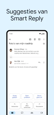 Als integraal onderdeel van Google Workspace stelt Gmail u en uw team in staat om naadloos samen te werken en te creëren. Profiteer van geïntegreerde tools om direct te reageren op Google Agenda-uitnodigingen en laat namen van contactpersonen automatisch aanvullen tijdens het typen. Slimme functies zoals Smart Compose, grammaticale suggesties en 'porren' helpen u proactief te blijven en routinetaken te stroomlijnen, zodat u zich kunt concentreren op hetgeen wat echt belangrijk is. Zelfs onderweg bent u volledig verbonden; voeg een Gmail-complicatie en -tegel toe aan uw Wear OS-smartwatch voor een snel overzicht van uw meest recente berichten.