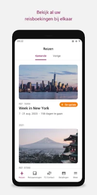 Na de boeking zorgt myTC ervoor dat u volledig geïnformeerd en voorbereid bent. Bewaar al uw belangrijke reisdocumenten – van vluchtschema's tot hotelreserveringen – veilig en overzichtelijk op één centrale plek, met gemakkelijke toegang tot updates. Deel uw reisplannen en de contactgegevens van uw Travel Counsellor moeiteloos met familie en vrienden, zodat zij altijd op de hoogte zijn van uw whereabouts. Een ingebouwde afteller verhoogt de voorpret, terwijl directe waarschuwingen bij vluchtwijzigingen u gemoedsrust bieden. Ook tijdens uw reis blijft myTC uw onmisbare begeleider: raadpleeg al uw documentatie met één tik en neem direct contact op met uw reisadviseur via telefoon of e-mail, mocht dat nodig zijn.